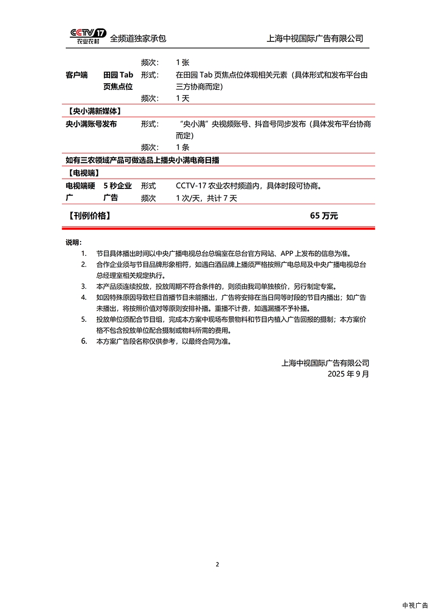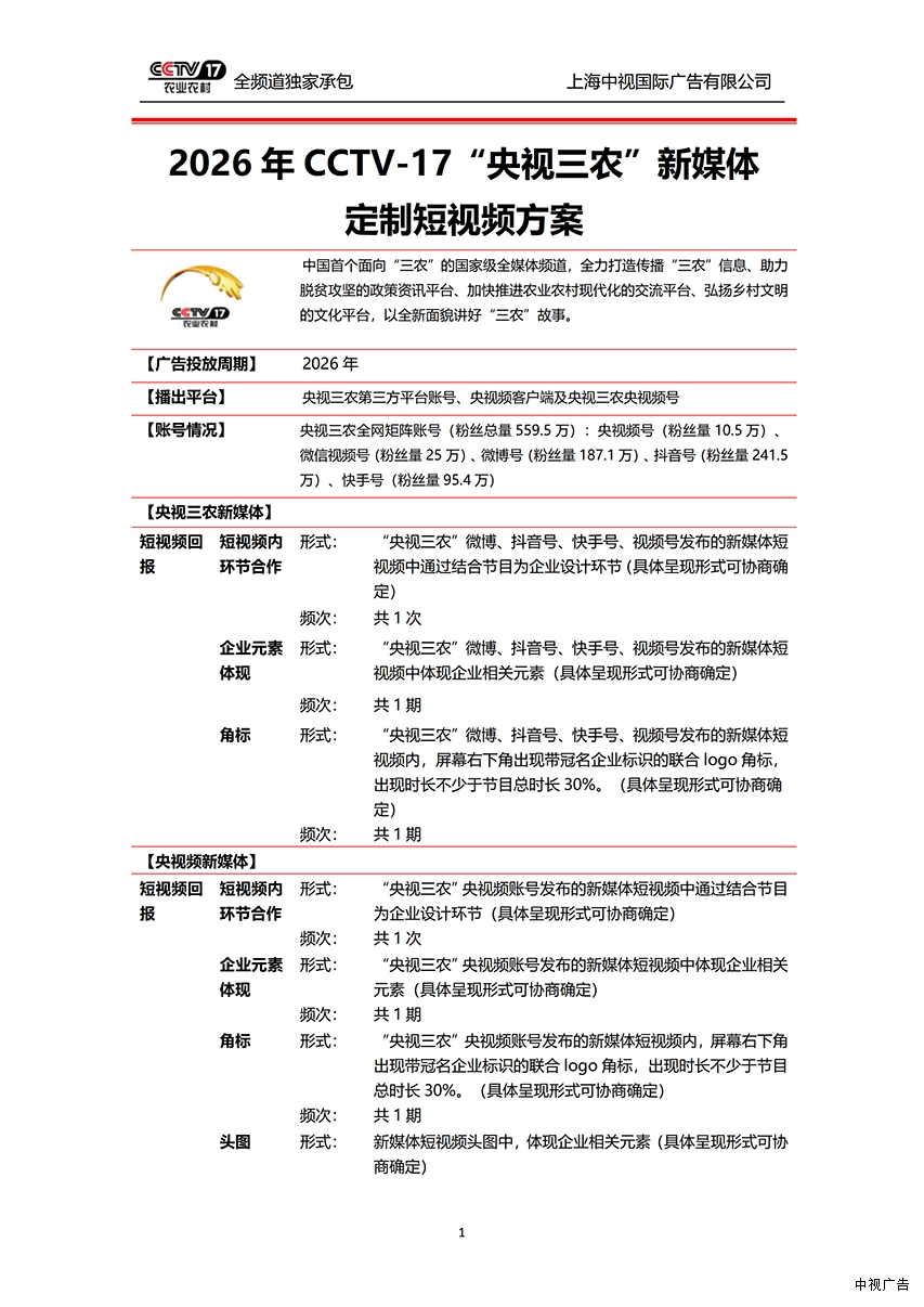 2026年CCTV-17“央视三农”定制短视频单期通案