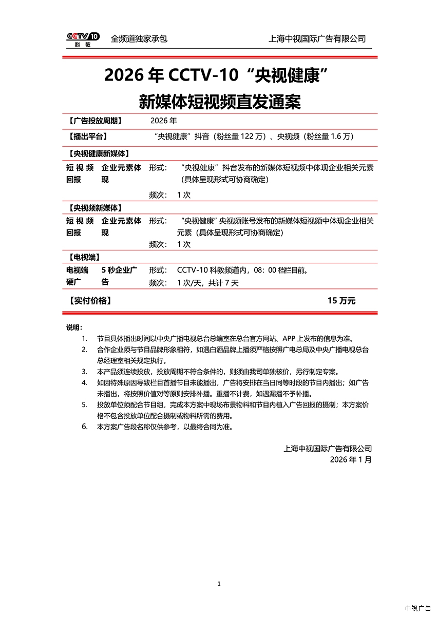 2026年CCTV-10 “央视健康”新媒体短视频直发和环节合作直播通案