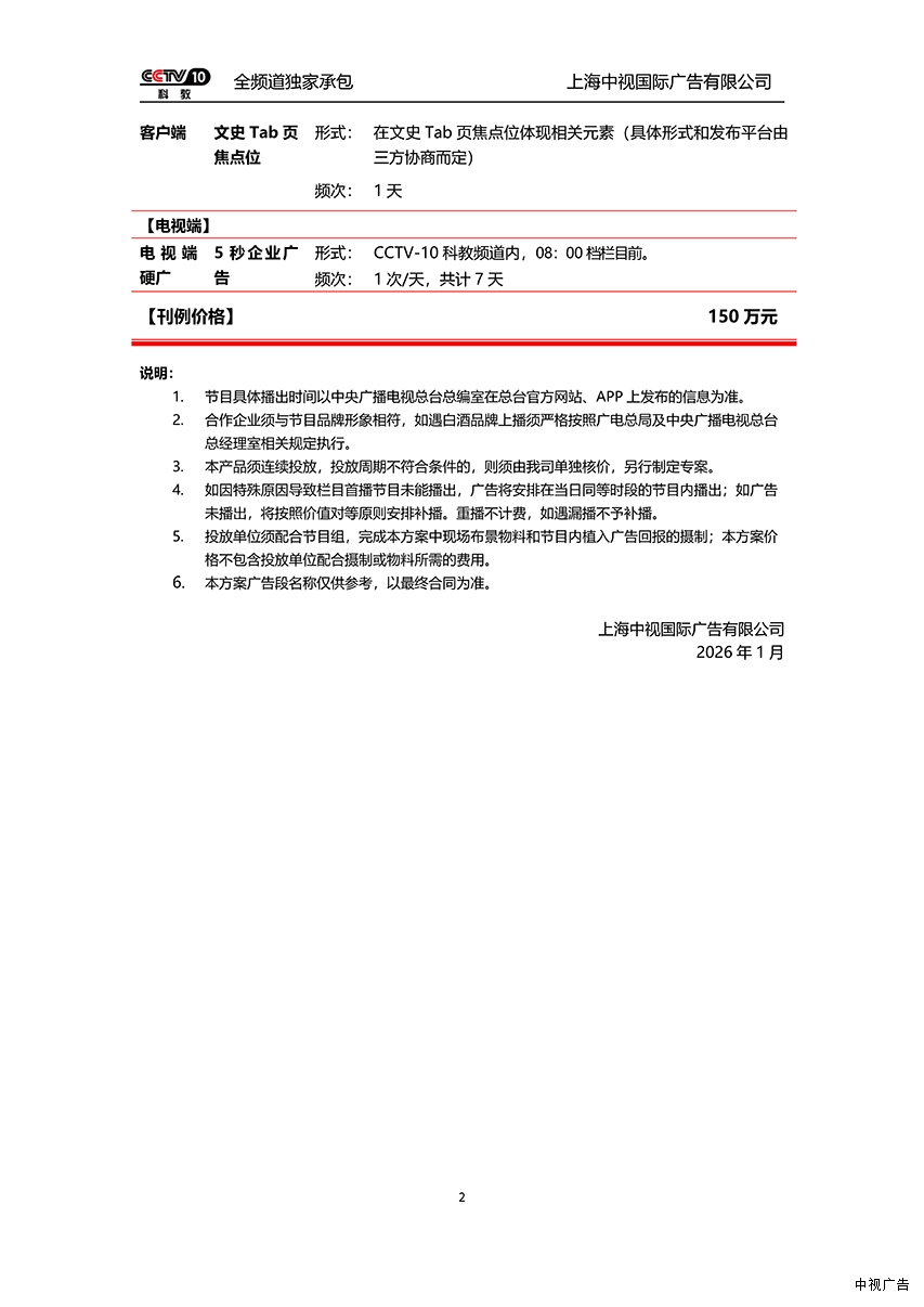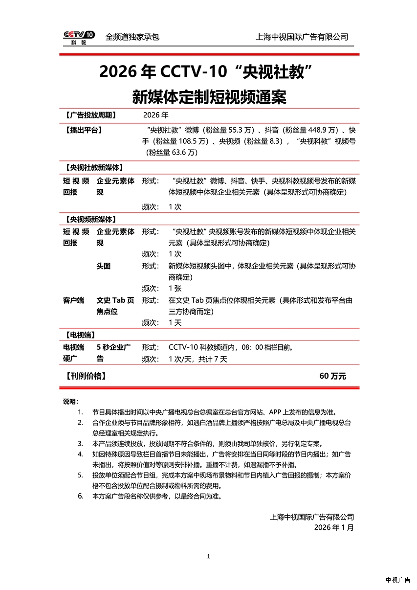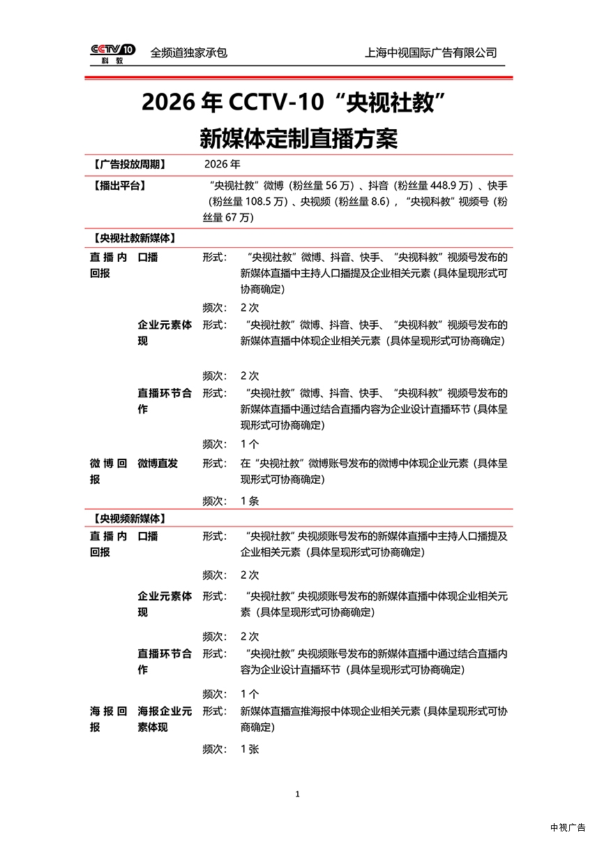 2026年CCTV-10 “央视社教” 新媒体定制短视频和定制直播通案