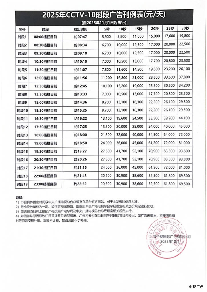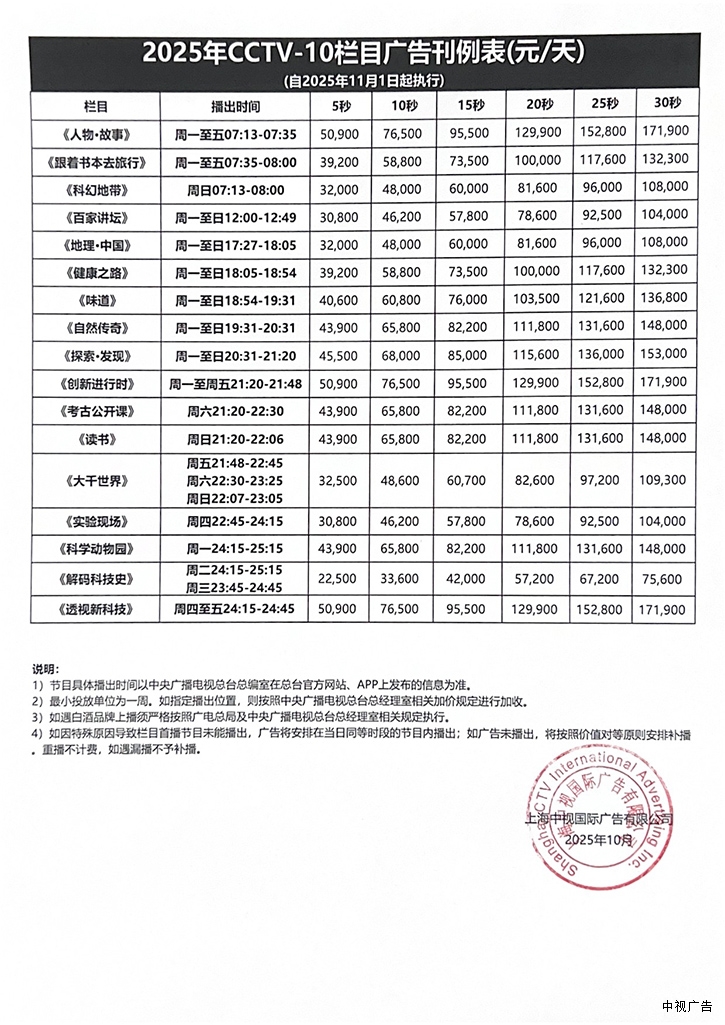 2025年11月1日起CCTV-10常规刊例价