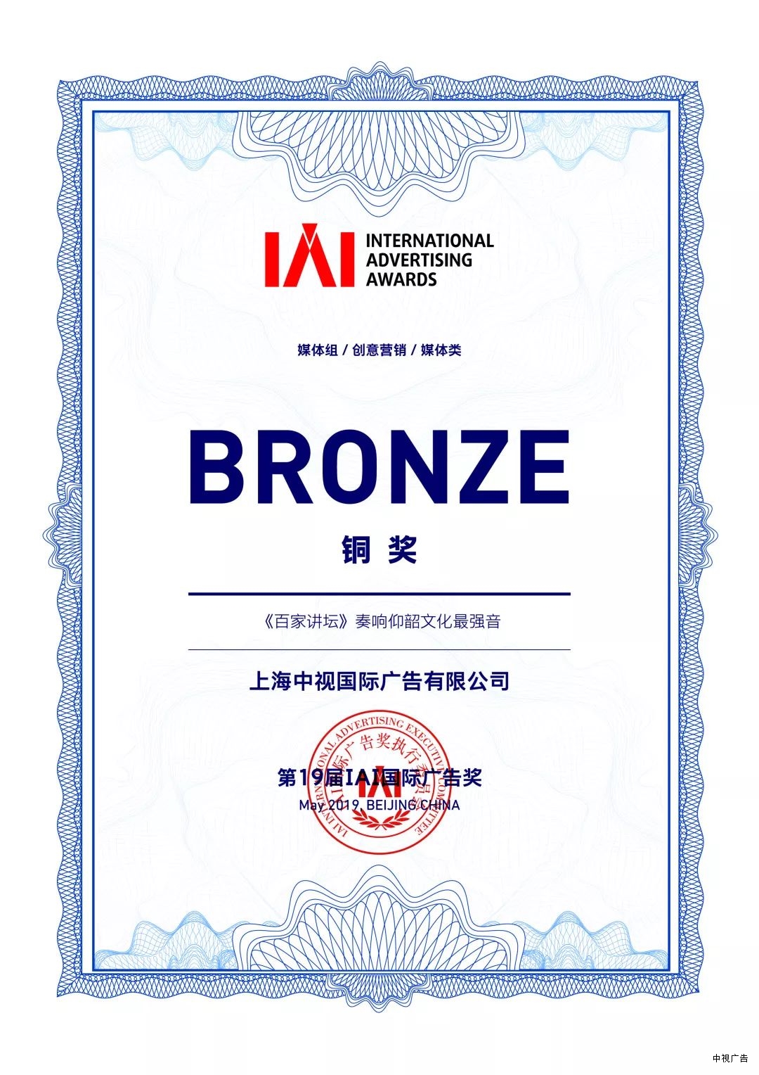中视广告提交的“《〈百家讲坛〉奏响仰韶文化最强音》案例,从各大广告公司提交的2693件作品中脱颖而出,受到了来自学术界、企业界、媒体界、广告界权威知名人士组成的专业终审团的青睐,荣获“第19届IAI国际广告奖”媒体组/创意营销/媒体类铜奖。